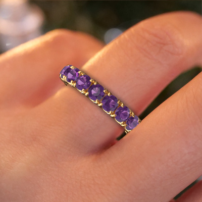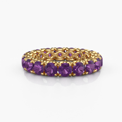 This is our Estee 3.7 ring. This specific type is called an eternity ring and it is set with a continuous line of identically cut gemstones. The ring is made in 14 Carat gold and is set with small amethysten, 3.7 mm. The amazing amethysten are identical in size and are set in the ring band. Our amethysten are selected with great care so they are identical, which gives the best result. In order to get the best result, our artisans position all amethysten by hand with the utmost care. Our Goldsmiths have one ambition, which is creating the perfect ring. That is why we love what we do. In the end you get a stunning classic gold stackable ring with a row of amethysten which seem to have no beginning nor end. The perfect symbol of your undying love for her! How special is that!After receiving your order, our goldsmiths will passionately start the creative process of making your ring in our own studio. Because we don't have a big stockpile, these costs will not be passed on to you. Our pricing is proof of that! We offer top quality jewels at lowest price, guaranteed.Our talented designers add new designs to our online collection daily. Together they create a diverse collection of the finest jewellery. If you prefer to make a ring according your own design, please feel free to request a quote. We will make you an amazing offer, based on quality and price.To make it easier for you, we offer a 30 day return policy. Check our terms and conditions.