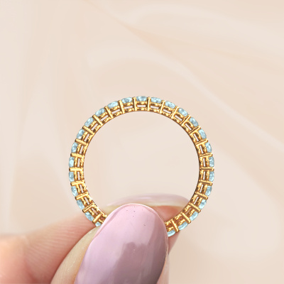 This is our Michelle full 2.0 ring. This specific type is called an eternity ring and it is set with a continuous line of identically cut gemstones. The ring is made in 14 Carat gold and is set with small aquamarine, 2 mm. The amazing aquamarine are identical in size and are set in the ring band. Our aquamarine are selected with great care so they are identical, which gives the best result. In order to get the best result, our artisans position all aquamarine by hand with the utmost care. Our Goldsmiths have one ambition, which is creating the perfect ring. That is why we love what we do. In the end you get a stunning classic gold stackable ring with a row of aquamarine which seem to have no beginning nor end. The perfect symbol of your undying love for her! How special is that!By using a combination of the latest modern techniques, combined with ancient crafting, we can make all our rings in our own studio. Each jewel is made to order. This is advantageous because we can offer you a price you won't find anywhere else.New jewellery designs are added to our online collection daily. Our team of passionate designers strive to create extraordinary and diverse designs. Have you seen a ring you like? Please feel free to contact us. Based on a good price/ quality ratio, we will make you an offer you can't refuse!To make it easier for you, we offer a 30 day return policy. Check our terms and conditions.