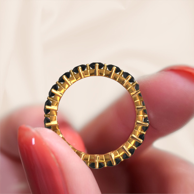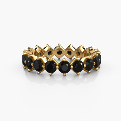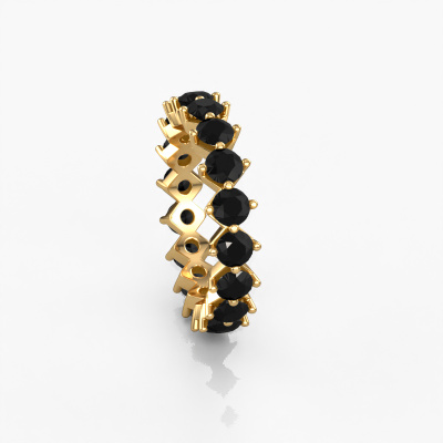 This is our Janie 3.4mm ring. This specific type is called an eternity ring and it is set with a continuous line of identically cut gemstones. The ring is made in 14 Carat gold and is set with small black diamonds, 3.600 crt. The amazing black diamonds are identical in size and are set in the ring band. Our black diamonds are selected with great care so they are identical, which gives the best result. In order to get the best result, our artisans position all black diamonds by hand with the utmost care. Our Goldsmiths have one ambition, which is creating the perfect ring. That is why we love what we do. In the end you get a stunning luxury gold stackable ring with a row of black diamonds which seem to have no beginning nor end. The perfect symbol of your undying love for her! How special is that!After receiving your order, our goldsmiths will passionately start the creative process of making your ring in our own studio. Because we don't have a big stockpile, these costs will not be passed on to you. Our pricing is proof of that! We offer top quality jewels at lowest price, guaranteed.Our talented designers add new designs to our online collection daily. Together they create a diverse collection of the finest jewellery. If you prefer to make a ring according your own design, please feel free to request a quote. We will make you an amazing offer, based on quality and price.To make it easier for you, we offer a 30 day return policy. Check our terms and conditions.