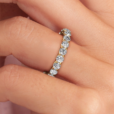This is our Michelle full 3.0 ring. This specific type is called an eternity ring and it is set with a continuous line of identically cut gemstones. The ring is made in 14 Carat gold and is set with small lab-grown diamonds, 2.20 crt. The amazing lab-grown diamonds are identical in size and are set in the ring band. Our lab-grown diamonds are selected with great care so they are identical, which gives the best result. In order to get the best result, our artisans position all lab-grown diamonds by hand with the utmost care. Our Goldsmiths have one ambition, which is creating the perfect ring. That is why we love what we do. In the end you get a stunning classic gold stackable ring with a row of lab-grown diamonds which seem to have no beginning nor end. The perfect symbol of your undying love for her! How special is that!Because we design and deliver our own rings, we can offer you a ring at a price you won't find anywhere else. A ring is made to order, which helps prevent excess supplies, so we can make you a great price offer. We understand it feels risky, buying your ring online, but we will gladly assist in the designing process, taking your budget into consideration.Our talented designers add new designs to our online collection daily. Together they create a diverse collection of the finest jewellery. If you prefer to make a ring according your own design, please feel free to request a quote. We will make you an amazing offer, based on quality and price.To make it easier for you, we offer a 30 day return policy. Check our terms and conditions.