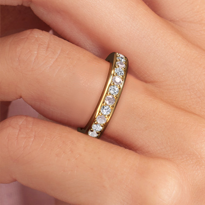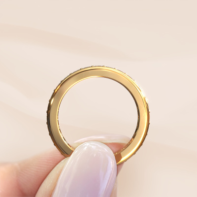 This is our Nienke ring. This specific type is called an eternity ring and it is set with a continuous line of identically cut gemstones. The ring is made in 14 Carat gold and is set with small morganite champagne, 2.2 mm. The amazing morganite champagne are identical in size and are set in the ring band. Our morganite champagne are selected with great care so they are identical, which gives the best result. In order to get the best result, our artisans position all morganite champagne by hand with the utmost care. Our Goldsmiths have one ambition, which is creating the perfect ring. That is why we love what we do. In the end you get a stunning exclusive gold stackable ring with a row of morganite champagne which seem to have no beginning nor end. The perfect symbol of your undying love for her! How special is that!