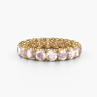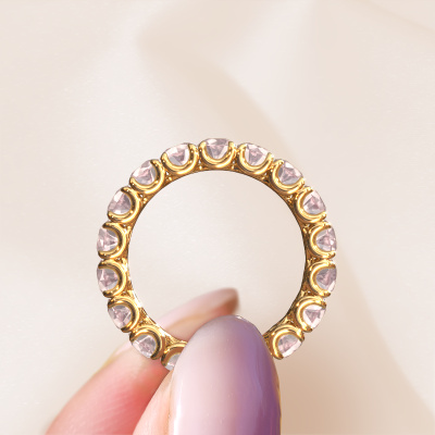 This is our Estee 3.7 ring. This specific type is called an eternity ring and it is set with a continuous line of identically cut gemstones. The ring is made in 14 Carat gold and is set with small morganite champagne, 3.7 mm. The amazing morganite champagne are identical in size and are set in the ring band. Our morganite champagne are selected with great care so they are identical, which gives the best result. In order to get the best result, our artisans position all morganite champagne by hand with the utmost care. Our Goldsmiths have one ambition, which is creating the perfect ring. That is why we love what we do. In the end you get a stunning fantasy gold stackable ring with a row of morganite champagne which seem to have no beginning nor end. The perfect symbol of your undying love for her! How special is that!