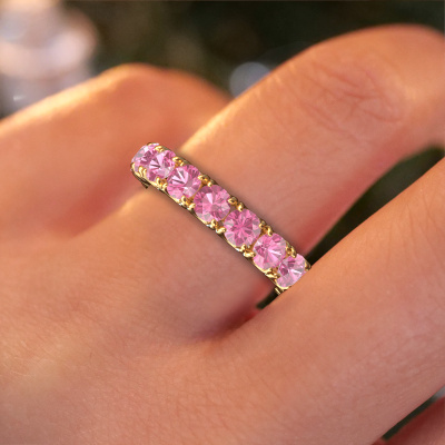 This is our Estee 3.7 ring. This specific type is called an eternity ring and it is set with a continuous line of identically cut gemstones. The ring is made in 14 Carat gold and is set with small pink sapphire, 3.7 mm. The amazing pink sapphire are identical in size and are set in the ring band. Our pink sapphire are selected with great care so they are identical, which gives the best result. In order to get the best result, our artisans position all pink sapphire by hand with the utmost care. Our Goldsmiths have one ambition, which is creating the perfect ring. That is why we love what we do. In the end you get a stunning classic gold stackable ring with a row of pink sapphire which seem to have no beginning nor end. The perfect symbol of your undying love for her! How special is that!After receiving your order, our goldsmiths will passionately start the creative process of making your ring in our own studio. Because we don't have a big stockpile, these costs will not be passed on to you. Our pricing is proof of that! We offer top quality jewels at lowest price, guaranteed.Our talented designers add new designs to our online collection daily. Together they create a diverse collection of the finest jewellery. If you prefer to make a ring according your own design, please feel free to request a quote. We will make you an amazing offer, based on quality and price.To make it easier for you, we offer a 30 day return policy. Check our terms and conditions.