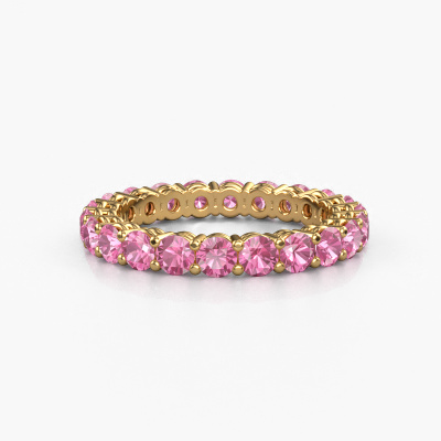 This is our Michelle full 3.0 ring. This specific type is called an eternity ring and it is set with a continuous line of identically cut gemstones. The ring is made in 14 Carat gold and is set with small pink sapphire, 3 mm. The amazing pink sapphire are identical in size and are set in the ring band. Our pink sapphire are selected with great care so they are identical, which gives the best result. In order to get the best result, our artisans position all pink sapphire by hand with the utmost care. Our Goldsmiths have one ambition, which is creating the perfect ring. That is why we love what we do. In the end you get a stunning classic gold stackable ring with a row of pink sapphire which seem to have no beginning nor end. The perfect symbol of your undying love for her! How special is that!Because we design and deliver our own rings, we can offer you a ring at a price you won't find anywhere else. A ring is made to order, which helps prevent excess supplies, so we can make you a great price offer. We understand it feels risky, buying your ring online, but we will gladly assist in the designing process, taking your budget into consideration.Our talented designers add new designs to our online collection daily. Together they create a diverse collection of the finest jewellery. If you prefer to make a ring according your own design, please feel free to request a quote. We will make you an amazing offer, based on quality and price.To make it easier for you, we offer a 30 day return policy. Check our terms and conditions.