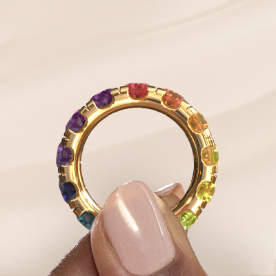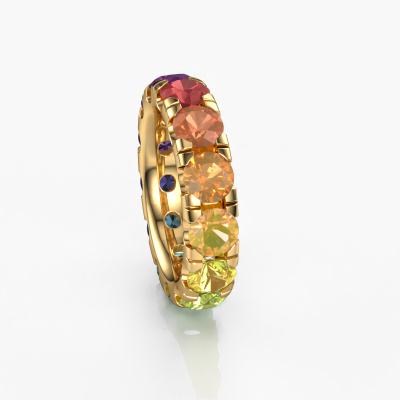 This is our Jackie 5.0 ring. This specific type is called an eternity ring and it is set with a continuous line of identically cut gemstones. The ring is made in 14 Carat gold and is set with small Rainbow sapphire 1, 5 mm. The amazing Rainbow sapphire 1 are identical in size and are set in the ring band. Our Rainbow sapphire 1 are selected with great care so they are identical, which gives the best result. In order to get the best result, our artisans position all Rainbow sapphire 1 by hand with the utmost care. Our Goldsmiths have one ambition, which is creating the perfect ring. That is why we love what we do. In the end you get a stunning exclusive gold stackable ring with a row of Rainbow sapphire 1 which seem to have no beginning nor end. The perfect symbol of your undying love for her! How special is that!After receiving your order, our goldsmiths will passionately start the creative process of making your ring in our own studio. Because we don't have a big stockpile, these costs will not be passed on to you. Our pricing is proof of that! We offer top quality jewels at lowest price, guaranteed.Our talented designers add new designs to our online collection daily. Together they create a diverse collection of the finest jewellery. If you prefer to make a ring according your own design, please feel free to request a quote. We will make you an amazing offer, based on quality and price.To make it easier for you, we offer a 30 day return policy. Check our terms and conditions.