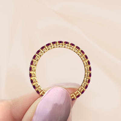 This is our Michelle full 2.0 ring. This specific type is called an eternity ring and it is set with a continuous line of identically cut gemstones. The ring is made in 14 Carat gold and is set with small rhodolite, 2 mm. The amazing rhodolite are identical in size and are set in the ring band. Our rhodolite are selected with great care so they are identical, which gives the best result. In order to get the best result, our artisans position all rhodolite by hand with the utmost care. Our Goldsmiths have one ambition, which is creating the perfect ring. That is why we love what we do. In the end you get a stunning classic gold stackable ring with a row of rhodolite which seem to have no beginning nor end. The perfect symbol of your undying love for her! How special is that!By using a combination of the latest modern techniques, combined with ancient crafting, we can make all our rings in our own studio. Each jewel is made to order. This is advantageous because we can offer you a price you won't find anywhere else.New jewellery designs are added to our online collection daily. Our team of passionate designers strive to create extraordinary and diverse designs. Have you seen a ring you like? Please feel free to contact us. Based on a good price/ quality ratio, we will make you an offer you can't refuse!To make it easier for you, we offer a 30 day return policy. Check our terms and conditions.