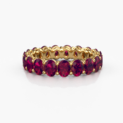 This is our Heddy OVL 3.5x4.5 ring. This specific type is called an eternity ring and it is set with a continuous line of identically cut gemstones. The ring is made in 14 Carat gold and is set with small rhodolite, 4.5x3.5 mm. The amazing rhodolite are identical in size and are set in the ring band. Our rhodolite are selected with great care so they are identical, which gives the best result. In order to get the best result, our artisans position all rhodolite by hand with the utmost care. Our Goldsmiths have one ambition, which is creating the perfect ring. That is why we love what we do. In the end you get a stunning fantasy gold stackable ring with a row of rhodolite which seem to have no beginning nor end. The perfect symbol of your undying love for her! How special is that!By using a combination of the latest modern techniques, combined with ancient crafting, we can make all our rings in our own studio. Each jewel is made to order. This is advantageous because we can offer you a price you won't find anywhere else.Our team of talented, passionate designers add new ring designs to our online collection daily. Our objective in doing so, is to be able to offer you a wide variety of jewels. Please feel free to request a quote if you have specific wishes for your ring. We guarantee to make you an offer you can't refuse.To make it easier for you, we offer a 30 day return policy. Check our terms and conditions.