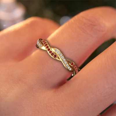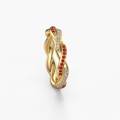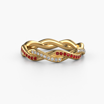 This is our Swing full ring. This specific type is called an eternity ring and it is set with a continuous line of identically cut gemstones. The ring is made in 14 Carat gold and is set with small ruby, 1 mm. The amazing ruby are identical in size and are set in the ring band. Our ruby are selected with great care so they are identical, which gives the best result. In order to get the best result, our artisans position all ruby by hand with the utmost care. Our Goldsmiths have one ambition, which is creating the perfect ring. That is why we love what we do. In the end you get a stunning fantasy gold stackable ring with a row of ruby which seem to have no beginning nor end. The perfect symbol of your undying love for her! How special is that!After receiving your order, our goldsmiths will passionately start the creative process of making your ring in our own studio. Because we don't have a big stockpile, these costs will not be passed on to you. Our pricing is proof of that! We offer top quality jewels at lowest price, guaranteed.New jewellery designs are added to our online collection daily. Our team of passionate designers strive to create extraordinary and diverse designs. Have you seen a ring you like? Please feel free to contact us. Based on a good price/ quality ratio, we will make you an offer you can't refuse!To make it easier for you, we offer a 30 day return policy. Check our terms and conditions.
