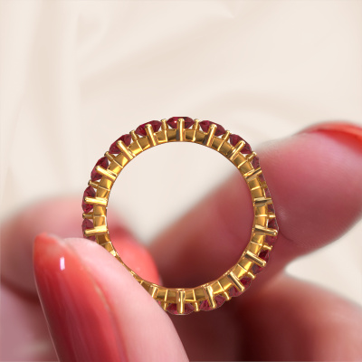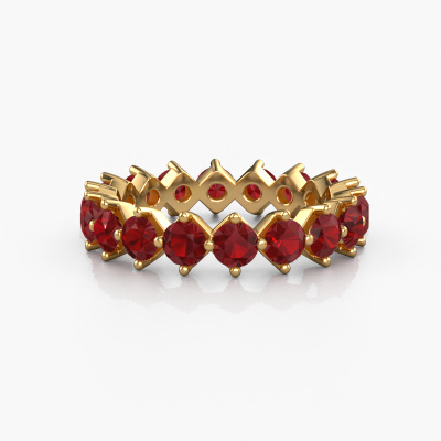 This is our Janie 3.4mm ring. This specific type is called an eternity ring and it is set with a continuous line of identically cut gemstones. The ring is made in 14 Carat gold and is set with small ruby, 3.4 mm. The amazing ruby are identical in size and are set in the ring band. Our ruby are selected with great care so they are identical, which gives the best result. In order to get the best result, our artisans position all ruby by hand with the utmost care. Our Goldsmiths have one ambition, which is creating the perfect ring. That is why we love what we do. In the end you get a stunning luxury gold stackable ring with a row of ruby which seem to have no beginning nor end. The perfect symbol of your undying love for her! How special is that!After receiving your order, our goldsmiths will passionately start the creative process of making your ring in our own studio. Because we don't have a big stockpile, these costs will not be passed on to you. Our pricing is proof of that! We offer top quality jewels at lowest price, guaranteed.Our talented designers add new designs to our online collection daily. Together they create a diverse collection of the finest jewellery. If you prefer to make a ring according your own design, please feel free to request a quote. We will make you an amazing offer, based on quality and price.To make it easier for you, we offer a 30 day return policy. Check our terms and conditions.