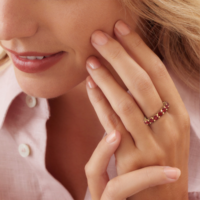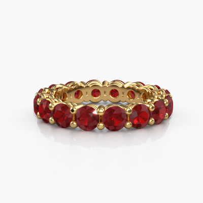 This is our Michelle full 4.0 ring. This specific type is called an eternity ring and it is set with a continuous line of identically cut gemstones. The ring is made in 14 Carat gold and is set with small ruby, 4 mm. The amazing ruby are identical in size and are set in the ring band. Our ruby are selected with great care so they are identical, which gives the best result. In order to get the best result, our artisans position all ruby by hand with the utmost care. Our Goldsmiths have one ambition, which is creating the perfect ring. That is why we love what we do. In the end you get a stunning modern gold stackable ring with a row of ruby which seem to have no beginning nor end. The perfect symbol of your undying love for her! How special is that!By using a combination of the latest modern techniques, combined with ancient crafting, we can make all our rings in our own studio. Each jewel is made to order. This is advantageous because we can offer you a price you won't find anywhere else.Our talented designers add new designs to our online collection daily. Together they create a diverse collection of the finest jewellery. If you prefer to make a ring according your own design, please feel free to request a quote. We will make you an amazing offer, based on quality and price.To make it easier for you, we offer a 30 day return policy. Check our terms and conditions.