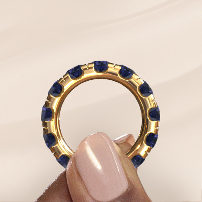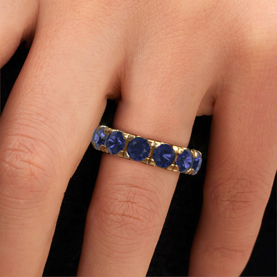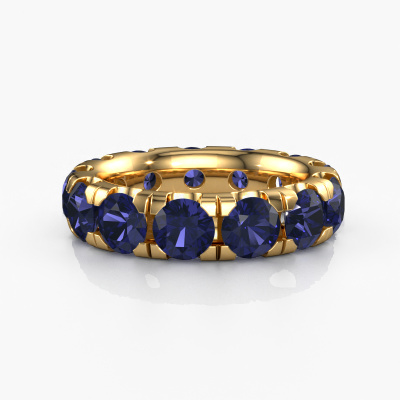 This is our Jackie 5.0 ring. This specific type is called an eternity ring and it is set with a continuous line of identically cut gemstones. The ring is made in 14 Carat gold and is set with small sapphire, 5 mm. The amazing sapphire are identical in size and are set in the ring band. Our sapphire are selected with great care so they are identical, which gives the best result. In order to get the best result, our artisans position all sapphire by hand with the utmost care. Our Goldsmiths have one ambition, which is creating the perfect ring. That is why we love what we do. In the end you get a stunning exclusive gold stackable ring with a row of sapphire which seem to have no beginning nor end. The perfect symbol of your undying love for her! How special is that!After receiving your order, our goldsmiths will passionately start the creative process of making your ring in our own studio. Because we don't have a big stockpile, these costs will not be passed on to you. Our pricing is proof of that! We offer top quality jewels at lowest price, guaranteed.Our talented designers add new designs to our online collection daily. Together they create a diverse collection of the finest jewellery. If you prefer to make a ring according your own design, please feel free to request a quote. We will make you an amazing offer, based on quality and price.To make it easier for you, we offer a 30 day return policy. Check our terms and conditions.