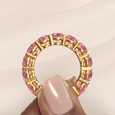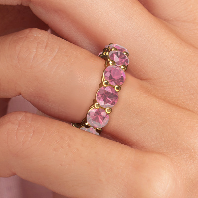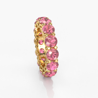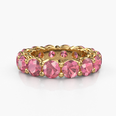 This is our Michelle full 5.0 ring. This specific type is called an eternity ring and it is set with a continuous line of identically cut gemstones. The ring is made in 14 Carat gold and is set with small tourmaline pink, 5 mm. The amazing tourmaline pink are identical in size and are set in the ring band. Our tourmaline pink are selected with great care so they are identical, which gives the best result. In order to get the best result, our artisans position all tourmaline pink by hand with the utmost care. Our Goldsmiths have one ambition, which is creating the perfect ring. That is why we love what we do. In the end you get a stunning exclusive gold stackable ring with a row of tourmaline pink which seem to have no beginning nor end. The perfect symbol of your undying love for her! How special is that!By using a combination of the latest modern techniques, combined with ancient crafting, we can make all our rings in our own studio. Each jewel is made to order. This is advantageous because we can offer you a price you won't find anywhere else.New jewellery designs are added to our online collection daily. Our team of passionate designers strive to create extraordinary and diverse designs. Have you seen a ring you like? Please feel free to contact us. Based on a good price/ quality ratio, we will make you an offer you can't refuse!To make it easier for you, we offer a 30 day return policy. Check our terms and conditions.