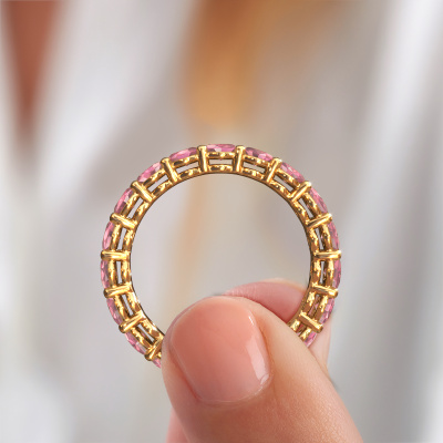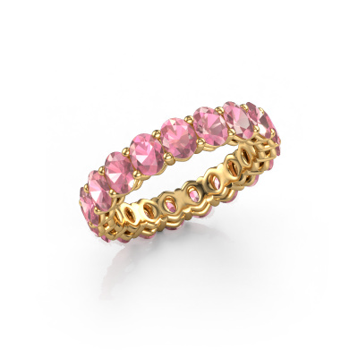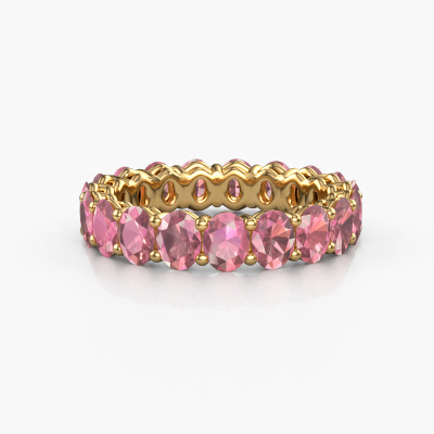This is our Heddy OVL 3.5x4.5 ring. This specific type is called an eternity ring and it is set with a continuous line of identically cut gemstones. The ring is made in 14 Carat gold and is set with small tourmaline pink, 4.5x3.5 mm. The amazing tourmaline pink are identical in size and are set in the ring band. Our tourmaline pink are selected with great care so they are identical, which gives the best result. In order to get the best result, our artisans position all tourmaline pink by hand with the utmost care. Our Goldsmiths have one ambition, which is creating the perfect ring. That is why we love what we do. In the end you get a stunning fantasy gold stackable ring with a row of tourmaline pink which seem to have no beginning nor end. The perfect symbol of your undying love for her! How special is that!By using a combination of the latest modern techniques, combined with ancient crafting, we can make all our rings in our own studio. Each jewel is made to order. This is advantageous because we can offer you a price you won't find anywhere else.Our team of talented, passionate designers add new ring designs to our online collection daily. Our objective in doing so, is to be able to offer you a wide variety of jewels. Please feel free to request a quote if you have specific wishes for your ring. We guarantee to make you an offer you can't refuse.To make it easier for you, we offer a 30 day return policy. Check our terms and conditions.