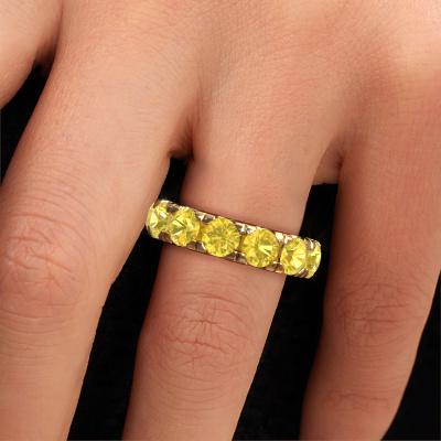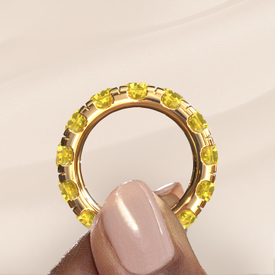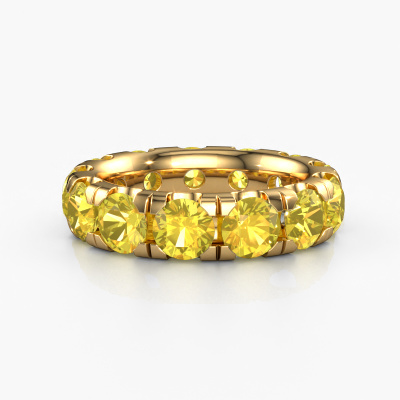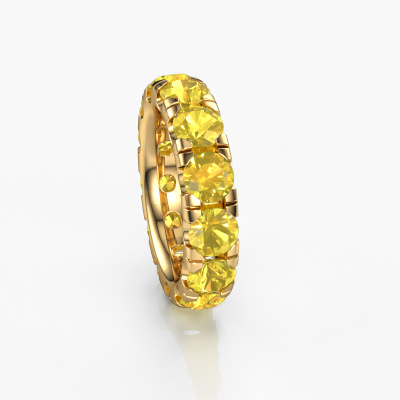 This is our Jackie 5.0 ring. This specific type is called an eternity ring and it is set with a continuous line of identically cut gemstones. The ring is made in 14 Carat gold and is set with small yellow sapphire, 5 mm. The amazing yellow sapphire are identical in size and are set in the ring band. Our yellow sapphire are selected with great care so they are identical, which gives the best result. In order to get the best result, our artisans position all yellow sapphire by hand with the utmost care. Our Goldsmiths have one ambition, which is creating the perfect ring. That is why we love what we do. In the end you get a stunning exclusive gold stackable ring with a row of yellow sapphire which seem to have no beginning nor end. The perfect symbol of your undying love for her! How special is that!After receiving your order, our goldsmiths will passionately start the creative process of making your ring in our own studio. Because we don't have a big stockpile, these costs will not be passed on to you. Our pricing is proof of that! We offer top quality jewels at lowest price, guaranteed.Our talented designers add new designs to our online collection daily. Together they create a diverse collection of the finest jewellery. If you prefer to make a ring according your own design, please feel free to request a quote. We will make you an amazing offer, based on quality and price.To make it easier for you, we offer a 30 day return policy. Check our terms and conditions.