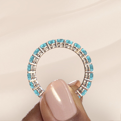 This is our Michelle full 3.0 ring. This specific type is called an eternity ring and it is set with a continuous line of identically cut gemstones. The ring is made in platinum and is set with small blue topaz, 3 mm. The amazing blue topaz are identical in size and are set in the ring band. Our blue topaz are selected with great care so they are identical, which gives the best result. In order to get the best result, our artisans position all blue topaz by hand with the utmost care. Our Goldsmiths have one ambition, which is creating the perfect ring. That is why we love what we do. In the end you get a stunning classic platinum stackable ring with a row of blue topaz which seem to have no beginning nor end. The perfect symbol of your undying love for her! How special is that!Because we design and deliver our own rings, we can offer you a ring at a price you won't find anywhere else. A ring is made to order, which helps prevent excess supplies, so we can make you a great price offer. We understand it feels risky, buying your ring online, but we will gladly assist in the designing process, taking your budget into consideration.Our talented designers add new designs to our online collection daily. Together they create a diverse collection of the finest jewellery. If you prefer to make a ring according your own design, please feel free to request a quote. We will make you an amazing offer, based on quality and price.To make it easier for you, we offer a 30 day return policy. Check our terms and conditions.