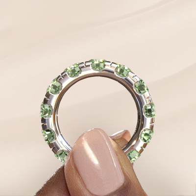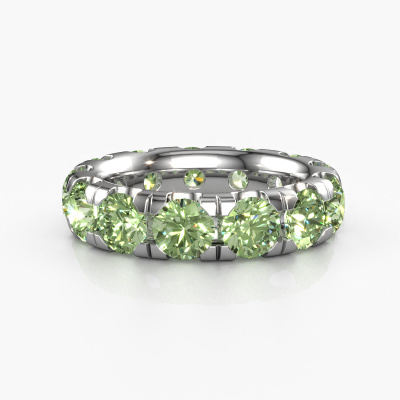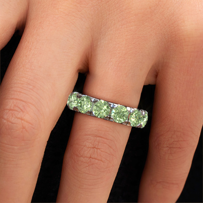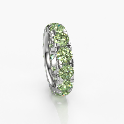 This is our Jackie 5.0 ring. This specific type is called an eternity ring and it is set with a continuous line of identically cut gemstones. The ring is made in platinum and is set with small green lab grown diamonds, 5 mm. The amazing green lab grown diamonds are identical in size and are set in the ring band. Our green lab grown diamonds are selected with great care so they are identical, which gives the best result. In order to get the best result, our artisans position all green lab grown diamonds by hand with the utmost care. Our Goldsmiths have one ambition, which is creating the perfect ring. That is why we love what we do. In the end you get a stunning exclusive platinum stackable ring with a row of green lab grown diamonds which seem to have no beginning nor end. The perfect symbol of your undying love for her! How special is that!After receiving your order, our goldsmiths will passionately start the creative process of making your ring in our own studio. Because we don't have a big stockpile, these costs will not be passed on to you. Our pricing is proof of that! We offer top quality jewels at lowest price, guaranteed.Our talented designers add new designs to our online collection daily. Together they create a diverse collection of the finest jewellery. If you prefer to make a ring according your own design, please feel free to request a quote. We will make you an amazing offer, based on quality and price.To make it easier for you, we offer a 30 day return policy. Check our terms and conditions.