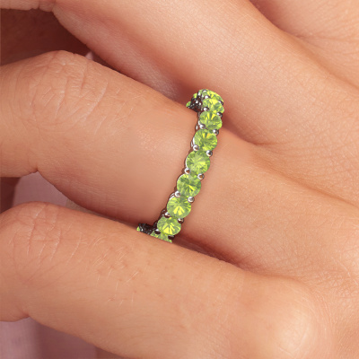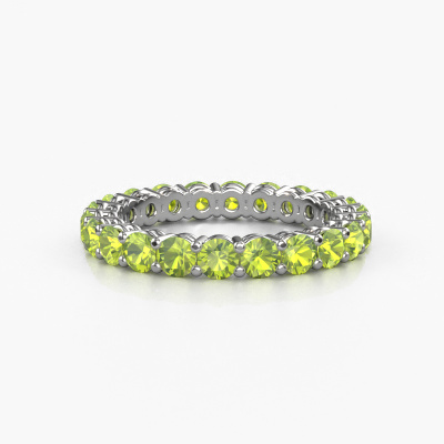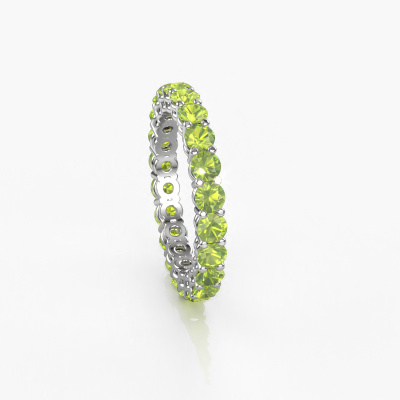 This is our Michelle full 3.0 ring. This specific type is called an eternity ring and it is set with a continuous line of identically cut gemstones. The ring is made in platinum and is set with small peridot, 3 mm. The amazing peridot are identical in size and are set in the ring band. Our peridot are selected with great care so they are identical, which gives the best result. In order to get the best result, our artisans position all peridot by hand with the utmost care. Our Goldsmiths have one ambition, which is creating the perfect ring. That is why we love what we do. In the end you get a stunning classic platinum stackable ring with a row of peridot which seem to have no beginning nor end. The perfect symbol of your undying love for her! How special is that!Because we design and deliver our own rings, we can offer you a ring at a price you won't find anywhere else. A ring is made to order, which helps prevent excess supplies, so we can make you a great price offer. We understand it feels risky, buying your ring online, but we will gladly assist in the designing process, taking your budget into consideration.Our talented designers add new designs to our online collection daily. Together they create a diverse collection of the finest jewellery. If you prefer to make a ring according your own design, please feel free to request a quote. We will make you an amazing offer, based on quality and price.To make it easier for you, we offer a 30 day return policy. Check our terms and conditions.