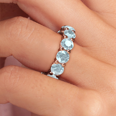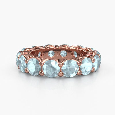 This is our Michelle full 5.0 ring. This specific type is called an eternity ring and it is set with a continuous line of identically cut gemstones. The ring is made in 14 Carat rose gold and is set with small aquamarine, 5 mm. The amazing aquamarine are identical in size and are set in the ring band. Our aquamarine are selected with great care so they are identical, which gives the best result. In order to get the best result, our artisans position all aquamarine by hand with the utmost care. Our Goldsmiths have one ambition, which is creating the perfect ring. That is why we love what we do. In the end you get a stunning exclusive rose gold stackable ring with a row of aquamarine which seem to have no beginning nor end. The perfect symbol of your undying love for her! How special is that!By using a combination of the latest modern techniques, combined with ancient crafting, we can make all our rings in our own studio. Each jewel is made to order. This is advantageous because we can offer you a price you won't find anywhere else.New jewellery designs are added to our online collection daily. Our team of passionate designers strive to create extraordinary and diverse designs. Have you seen a ring you like? Please feel free to contact us. Based on a good price/ quality ratio, we will make you an offer you can't refuse!To make it easier for you, we offer a 30 day return policy. Check our terms and conditions.