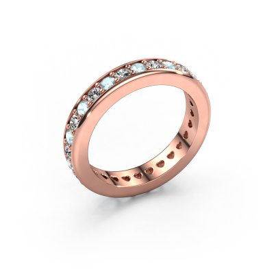 This is our Nienke ring. This specific type is called an eternity ring and it is set with a continuous line of identically cut gemstones. The ring is made in 14 Carat rose gold and is set with small aquamarine, 2.2 mm. The amazing aquamarine are identical in size and are set in the ring band. Our aquamarine are selected with great care so they are identical, which gives the best result. In order to get the best result, our artisans position all aquamarine by hand with the utmost care. Our Goldsmiths have one ambition, which is creating the perfect ring. That is why we love what we do. In the end you get a stunning modern rose gold stackable ring with a row of aquamarine which seem to have no beginning nor end. The perfect symbol of your undying love for her! How special is that!After receiving your order, our goldsmiths will start the creative process of making your Nienke ring. We don't keep stock. This is advantageous because these costs will not be passed on to you. Therefore, we can offer jewellery at exceptionally low prices.Our team of talented, passionate designers add new ring designs to our online collection daily. Our objective in doing so, is to be able to offer you a wide variety of jewels. Please feel free to request a quote if you have specific wishes for your ring. We guarantee to make you an offer you can't refuse.To make it easier for you, we offer a 30 day return policy. Check our terms and conditions.