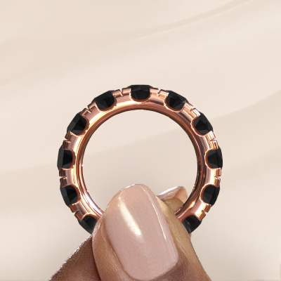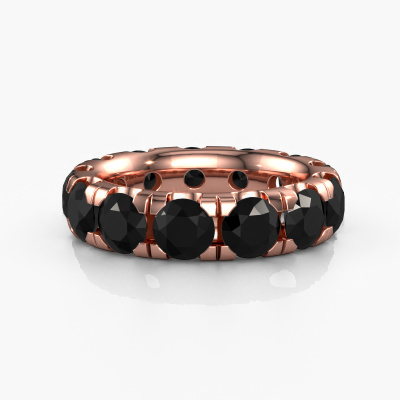 This is our Jackie 5.0 ring. This specific type is called an eternity ring and it is set with a continuous line of identically cut gemstones. The ring is made in 14 Carat rose gold and is set with small black diamonds, 7.80 crt. The amazing black diamonds are identical in size and are set in the ring band. Our black diamonds are selected with great care so they are identical, which gives the best result. In order to get the best result, our artisans position all black diamonds by hand with the utmost care. Our Goldsmiths have one ambition, which is creating the perfect ring. That is why we love what we do. In the end you get a stunning exclusive rose gold stackable ring with a row of black diamonds which seem to have no beginning nor end. The perfect symbol of your undying love for her! How special is that!After receiving your order, our goldsmiths will passionately start the creative process of making your ring in our own studio. Because we don't have a big stockpile, these costs will not be passed on to you. Our pricing is proof of that! We offer top quality jewels at lowest price, guaranteed.Our talented designers add new designs to our online collection daily. Together they create a diverse collection of the finest jewellery. If you prefer to make a ring according your own design, please feel free to request a quote. We will make you an amazing offer, based on quality and price.To make it easier for you, we offer a 30 day return policy. Check our terms and conditions.