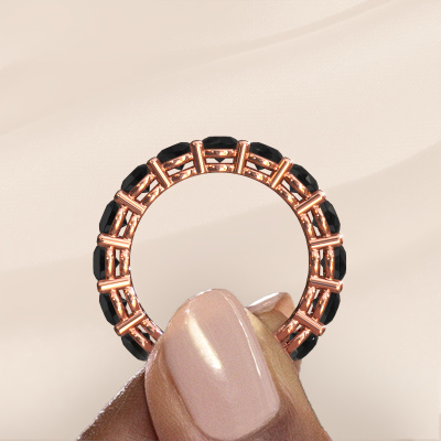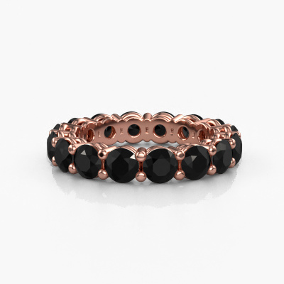 This is our Michelle full 4.0 ring. This specific type is called an eternity ring and it is set with a continuous line of identically cut gemstones. The ring is made in 14 Carat rose gold and is set with small black diamonds, 5.10 crt. The amazing black diamonds are identical in size and are set in the ring band. Our black diamonds are selected with great care so they are identical, which gives the best result. In order to get the best result, our artisans position all black diamonds by hand with the utmost care. Our Goldsmiths have one ambition, which is creating the perfect ring. That is why we love what we do. In the end you get a stunning modern rose gold stackable ring with a row of black diamonds which seem to have no beginning nor end. The perfect symbol of your undying love for her! How special is that!By using a combination of the latest modern techniques, combined with ancient crafting, we can make all our rings in our own studio. Each jewel is made to order. This is advantageous because we can offer you a price you won't find anywhere else.Our talented designers add new designs to our online collection daily. Together they create a diverse collection of the finest jewellery. If you prefer to make a ring according your own design, please feel free to request a quote. We will make you an amazing offer, based on quality and price.To make it easier for you, we offer a 30 day return policy. Check our terms and conditions.