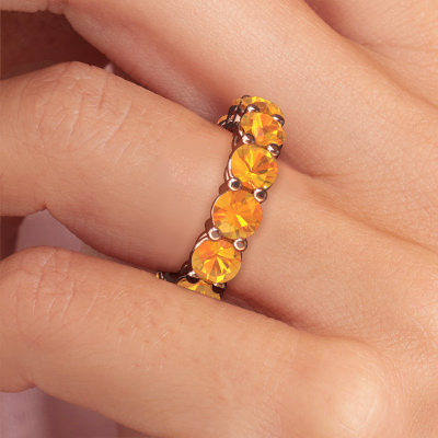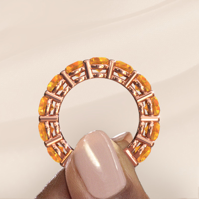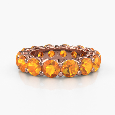 This is our Michelle full 5.0 ring. This specific type is called an eternity ring and it is set with a continuous line of identically cut gemstones. The ring is made in 14 Carat rose gold and is set with small citrin, 5 mm. The amazing citrin are identical in size and are set in the ring band. Our citrin are selected with great care so they are identical, which gives the best result. In order to get the best result, our artisans position all citrin by hand with the utmost care. Our Goldsmiths have one ambition, which is creating the perfect ring. That is why we love what we do. In the end you get a stunning exclusive rose gold stackable ring with a row of citrin which seem to have no beginning nor end. The perfect symbol of your undying love for her! How special is that!By using a combination of the latest modern techniques, combined with ancient crafting, we can make all our rings in our own studio. Each jewel is made to order. This is advantageous because we can offer you a price you won't find anywhere else.New jewellery designs are added to our online collection daily. Our team of passionate designers strive to create extraordinary and diverse designs. Have you seen a ring you like? Please feel free to contact us. Based on a good price/ quality ratio, we will make you an offer you can't refuse!To make it easier for you, we offer a 30 day return policy. Check our terms and conditions.