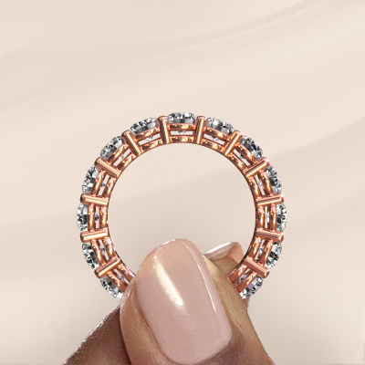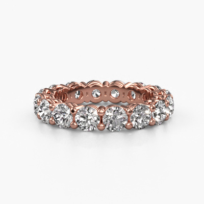 This is our Michelle full 4.0 ring. This specific type is called an eternity ring and it is set with a continuous line of identically cut gemstones. The ring is made in 14 Carat rose gold and is set with small diamonds, 4.25 crt. The amazing diamonds are identical in size and are set in the ring band. Our diamonds are selected with great care so they are identical, which gives the best result. In order to get the best result, our artisans position all diamonds by hand with the utmost care. Our Goldsmiths have one ambition, which is creating the perfect ring. That is why we love what we do. In the end you get a stunning modern rose gold stackable ring with a row of diamonds which seem to have no beginning nor end. The perfect symbol of your undying love for her! How special is that!By using a combination of the latest modern techniques, combined with ancient crafting, we can make all our rings in our own studio. Each jewel is made to order. This is advantageous because we can offer you a price you won't find anywhere else.Our talented designers add new designs to our online collection daily. Together they create a diverse collection of the finest jewellery. If you prefer to make a ring according your own design, please feel free to request a quote. We will make you an amazing offer, based on quality and price.To make it easier for you, we offer a 30 day return policy. Check our terms and conditions.