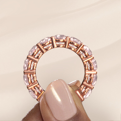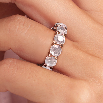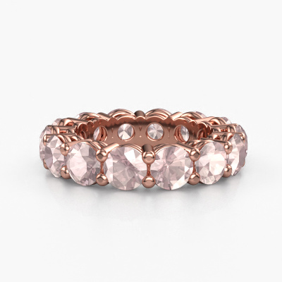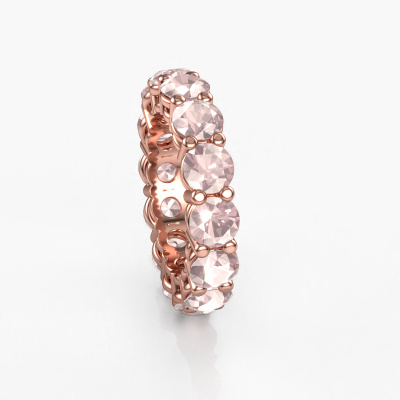 This is our Michelle full 5.0 ring. This specific type is called an eternity ring and it is set with a continuous line of identically cut gemstones. The ring is made in 14 Carat rose gold and is set with small morganite champagne, 5 mm. The amazing