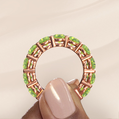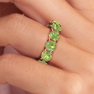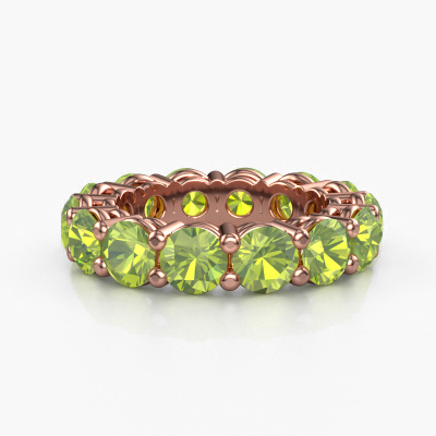 This is our Michelle full 5.0 ring. This specific type is called an eternity ring and it is set with a continuous line of identically cut gemstones. The ring is made in 14 Carat rose gold and is set with small peridot, 5 mm. The amazing peridot are identical in size and are set in the ring band. Our peridot are selected with great care so they are identical, which gives the best result. In order to get the best result, our artisans position all peridot by hand with the utmost care. Our Goldsmiths have one ambition, which is creating the perfect ring. That is why we love what we do. In the end you get a stunning exclusive rose gold stackable ring with a row of peridot which seem to have no beginning nor end. The perfect symbol of your undying love for her! How special is that!By using a combination of the latest modern techniques, combined with ancient crafting, we can make all our rings in our own studio. Each jewel is made to order. This is advantageous because we can offer you a price you won't find anywhere else.New jewellery designs are added to our online collection daily. Our team of passionate designers strive to create extraordinary and diverse designs. Have you seen a ring you like? Please feel free to contact us. Based on a good price/ quality ratio, we will make you an offer you can't refuse!To make it easier for you, we offer a 30 day return policy. Check our terms and conditions.