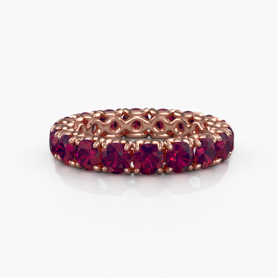 This is our Estee 3.7 ring. This specific type is called an eternity ring and it is set with a continuous line of identically cut gemstones. The ring is made in 14 Carat rose gold and is set with small rhodolite, 3.7 mm. The amazing rhodolite are identical in size and are set in the ring band. Our rhodolite are selected with great care so they are identical, which gives the best result. In order to get the best result, our artisans position all rhodolite by hand with the utmost care. Our Goldsmiths have one ambition, which is creating the perfect ring. That is why we love what we do. In the end you get a stunning classic rose gold stackable ring with a row of rhodolite which seem to have no beginning nor end. The perfect symbol of your undying love for her! How special is that!After receiving your order, our goldsmiths will passionately start the creative process of making your ring in our own studio. Because we don't have a big stockpile, these costs will not be passed on to you. Our pricing is proof of that! We offer top quality jewels at lowest price, guaranteed.Our talented designers add new designs to our online collection daily. Together they create a diverse collection of the finest jewellery. If you prefer to make a ring according your own design, please feel free to request a quote. We will make you an amazing offer, based on quality and price.To make it easier for you, we offer a 30 day return policy. Check our terms and conditions.