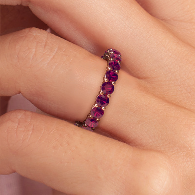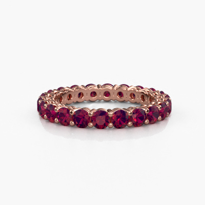 This is our Michelle full 3.0 ring. This specific type is called an eternity ring and it is set with a continuous line of identically cut gemstones. The ring is made in 14 Carat rose gold and is set with small rhodolite, 3 mm. The amazing rhodolite are identical in size and are set in the ring band. Our rhodolite are selected with great care so they are identical, which gives the best result. In order to get the best result, our artisans position all rhodolite by hand with the utmost care. Our Goldsmiths have one ambition, which is creating the perfect ring. That is why we love what we do. In the end you get a stunning classic rose gold stackable ring with a row of rhodolite which seem to have no beginning nor end. The perfect symbol of your undying love for her! How special is that!Because we design and deliver our own rings, we can offer you a ring at a price you won't find anywhere else. A ring is made to order, which helps prevent excess supplies, so we can make you a great price offer. We understand it feels risky, buying your ring online, but we will gladly assist in the designing process, taking your budget into consideration.Our talented designers add new designs to our online collection daily. Together they create a diverse collection of the finest jewellery. If you prefer to make a ring according your own design, please feel free to request a quote. We will make you an amazing offer, based on quality and price.To make it easier for you, we offer a 30 day return policy. Check our terms and conditions.