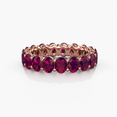 This is our Heddy OVL 3.5x4.5 ring. This specific type is called an eternity ring and it is set with a continuous line of identically cut gemstones. The ring is made in 14 Carat rose gold and is set with small rhodolite, 4.5x3.5 mm. The amazing rhodolite are identical in size and are set in the ring band. Our rhodolite are selected with great care so they are identical, which gives the best result. In order to get the best result, our artisans position all rhodolite by hand with the utmost care. Our Goldsmiths have one ambition, which is creating the perfect ring. That is why we love what we do. In the end you get a stunning fantasy rose gold stackable ring with a row of rhodolite which seem to have no beginning nor end. The perfect symbol of your undying love for her! How special is that!By using a combination of the latest modern techniques, combined with ancient crafting, we can make all our rings in our own studio. Each jewel is made to order. This is advantageous because we can offer you a price you won't find anywhere else.Our team of talented, passionate designers add new ring designs to our online collection daily. Our objective in doing so, is to be able to offer you a wide variety of jewels. Please feel free to request a quote if you have specific wishes for your ring. We guarantee to make you an offer you can't refuse.To make it easier for you, we offer a 30 day return policy. Check our terms and conditions.