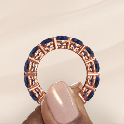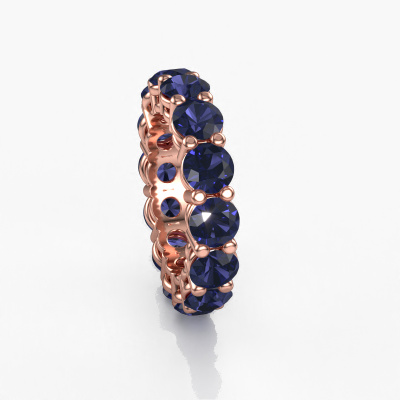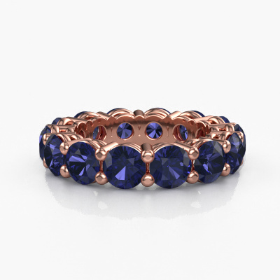 This is our Michelle full 5.0 ring. This specific type is called an eternity ring and it is set with a continuous line of identically cut gemstones. The ring is made in 14 Carat rose gold and is set with small sapphire, 5 mm. The amazing sapphire are identical in size and are set in the ring band. Our sapphire are selected with great care so they are identical, which gives the best result. In order to get the best result, our artisans position all sapphire by hand with the utmost care. Our Goldsmiths have one ambition, which is creating the perfect ring. That is why we love what we do. In the end you get a stunning exclusive rose gold stackable ring with a row of sapphire which seem to have no beginning nor end. The perfect symbol of your undying love for her! How special is that!By using a combination of the latest modern techniques, combined with ancient crafting, we can make all our rings in our own studio. Each jewel is made to order. This is advantageous because we can offer you a price you won't find anywhere else.New jewellery designs are added to our online collection daily. Our team of passionate designers strive to create extraordinary and diverse designs. Have you seen a ring you like? Please feel free to contact us. Based on a good price/ quality ratio, we will make you an offer you can't refuse!To make it easier for you, we offer a 30 day return policy. Check our terms and conditions.