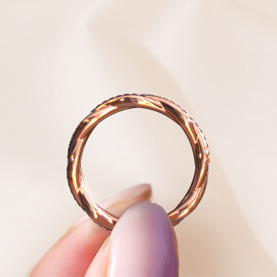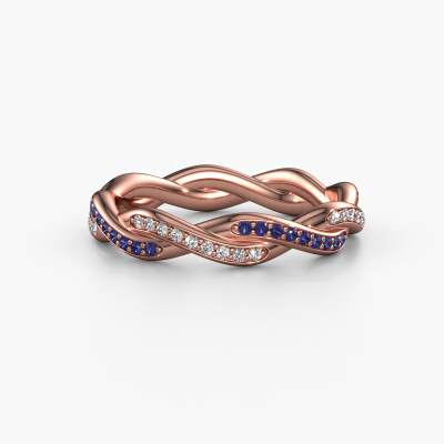 This is our Swing full ring. This specific type is called an eternity ring and it is set with a continuous line of identically cut gemstones. The ring is made in 14 Carat rose gold and is set with small sapphire, 1 mm. The amazing sapphire are identical in size and are set in the ring band. Our sapphire are selected with great care so they are identical, which gives the best result. In order to get the best result, our artisans position all sapphire by hand with the utmost care. Our Goldsmiths have one ambition, which is creating the perfect ring. That is why we love what we do. In the end you get a stunning fantasy rose gold stackable ring with a row of sapphire which seem to have no beginning nor end. The perfect symbol of your undying love for her! How special is that!After receiving your order, our goldsmiths will passionately start the creative process of making your ring in our own studio. Because we don't have a big stockpile, these costs will not be passed on to you. Our pricing is proof of that! We offer top quality jewels at lowest price, guaranteed.New jewellery designs are added to our online collection daily. Our team of passionate designers strive to create extraordinary and diverse designs. Have you seen a ring you like? Please feel free to contact us. Based on a good price/ quality ratio, we will make you an offer you can't refuse!To make it easier for you, we offer a 30 day return policy. Check our terms and conditions.