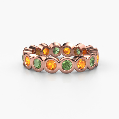 This is our Edwina 3 ring. This specific type is called an eternity ring and it is set with a continuous line of identically cut gemstones. The ring is made in 14 Carat rose gold and is set with small tourmaline green, 3 mm. The amazing tourmaline green are identical in size and are set in the ring band. Our tourmaline green are selected with great care so they are identical, which gives the best result. In order to get the best result, our artisans position all tourmaline green by hand with the utmost care. Our Goldsmiths have one ambition, which is creating the perfect ring. That is why we love what we do. In the end you get a stunning trendy rose gold stackable ring with a row of tourmaline green which seem to have no beginning nor end. The perfect symbol of your undying love for her! How special is that!After receiving your order, our goldsmiths will passionately start the creative process of making your ring in our own studio. Because we don't have a big stockpile, these costs will not be passed on to you. Our pricing is proof of that! We offer top quality jewels at lowest price, guaranteed.Our team of talented, passionate designers add new ring designs to our online collection daily. Our objective in doing so, is to be able to offer you a wide variety of jewels. Please feel free to request a quote if you have specific wishes for your ring. We guarantee to make you an offer you can't refuse.To make it easier for you, we offer a 30 day return policy. Check our terms and conditions.