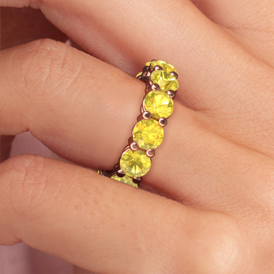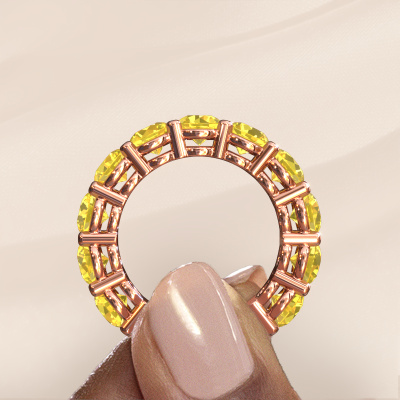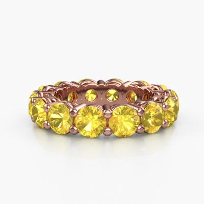 This is our Michelle full 5.0 ring. This specific type is called an eternity ring and it is set with a continuous line of identically cut gemstones. The ring is made in 14 Carat rose gold and is set with small yellow sapphire, 5 mm. The amazing yellow sapphire are identical in size and are set in the ring band. Our yellow sapphire are selected with great care so they are identical, which gives the best result. In order to get the best result, our artisans position all yellow sapphire by hand with the utmost care. Our Goldsmiths have one ambition, which is creating the perfect ring. That is why we love what we do. In the end you get a stunning exclusive rose gold stackable ring with a row of yellow sapphire which seem to have no beginning nor end. The perfect symbol of your undying love for her! How special is that!By using a combination of the latest modern techniques, combined with ancient crafting, we can make all our rings in our own studio. Each jewel is made to order. This is advantageous because we can offer you a price you won't find anywhere else.New jewellery designs are added to our online collection daily. Our team of passionate designers strive to create extraordinary and diverse designs. Have you seen a ring you like? Please feel free to contact us. Based on a good price/ quality ratio, we will make you an offer you can't refuse!To make it easier for you, we offer a 30 day return policy. Check our terms and conditions.