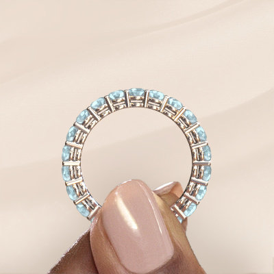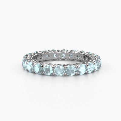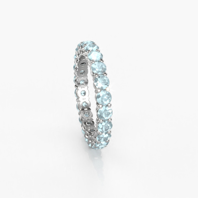This is our Michelle full 3.0 ring. This specific type is called an eternity ring and it is set with a continuous line of identically cut gemstones. The ring is made in 14 Carat white gold and is set with small aquamarine, 3 mm. The amazing aquamarine are identical in size and are set in the ring band. Our aquamarine are selected with great care so they are identical, which gives the best result. In order to get the best result, our artisans position all aquamarine by hand with the utmost care. Our Goldsmiths have one ambition, which is creating the perfect ring. That is why we love what we do. In the end you get a stunning classic white gold stackable ring with a row of aquamarine which seem to have no beginning nor end. The perfect symbol of your undying love for her! How special is that!Because we design and deliver our own rings, we can offer you a ring at a price you won't find anywhere else. A ring is made to order, which helps prevent excess supplies, so we can make you a great price offer. We understand it feels risky, buying your ring online, but we will gladly assist in the designing process, taking your budget into consideration.Our talented designers add new designs to our online collection daily. Together they create a diverse collection of the finest jewellery. If you prefer to make a ring according your own design, please feel free to request a quote. We will make you an amazing offer, based on quality and price.To make it easier for you, we offer a 30 day return policy. Check our terms and conditions.