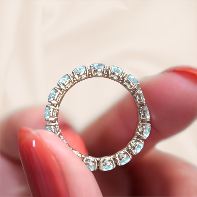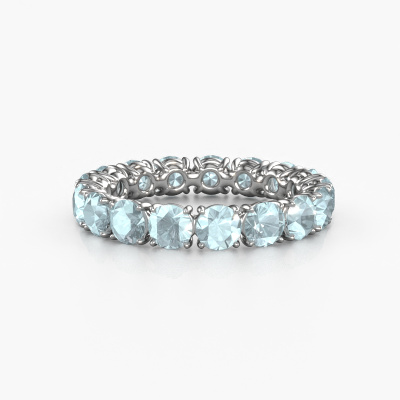 This is our Vivienne 3.7 ring. This specific type is called an eternity ring and it is set with a continuous line of identically cut gemstones. The ring is made in 14 Carat white gold and is set with small aquamarine, 3.7 mm. The amazing aquamarine are identical in size and are set in the ring band. Our aquamarine are selected with great care so they are identical, which gives the best result. In order to get the best result, our artisans position all aquamarine by hand with the utmost care. Our Goldsmiths have one ambition, which is creating the perfect ring. That is why we love what we do. In the end you get a stunning classic white gold stackable ring with a row of aquamarine which seem to have no beginning nor end. The perfect symbol of your undying love for her! How special is that!After receiving your order, our goldsmiths will start the creative process of making your Vivienne 3.7 ring. We don't keep stock. This is advantageous because these costs will not be passed on to you. Therefore, we can offer jewellery at exceptionally low prices.New jewellery designs are added to our online collection daily. Our team of passionate designers strive to create extraordinary and diverse designs. Have you seen a ring you like? Please feel free to contact us. Based on a good price/ quality ratio, we will make you an offer you can't refuse!To make it easier for you, we offer a 30 day return policy. Check our terms and conditions.