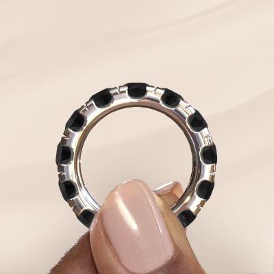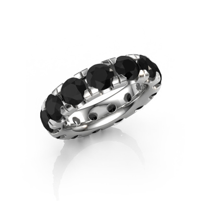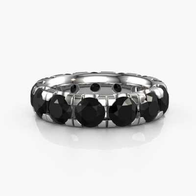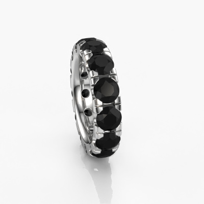 This is our Jackie 5.0 ring. This specific type is called an eternity ring and it is set with a continuous line of identically cut gemstones. The ring is made in 14 Carat white gold and is set with small black diamonds, 7.80 crt. The amazing black diamonds are identical in size and are set in the ring band. Our black diamonds are selected with great care so they are identical, which gives the best result. In order to get the best result, our artisans position all black diamonds by hand with the utmost care. Our Goldsmiths have one ambition, which is creating the perfect ring. That is why we love what we do. In the end you get a stunning exclusive white gold stackable ring with a row of black diamonds which seem to have no beginning nor end. The perfect symbol of your undying love for her! How special is that!After receiving your order, our goldsmiths will passionately start the creative process of making your ring in our own studio. Because we don't have a big stockpile, these costs will not be passed on to you. Our pricing is proof of that! We offer top quality jewels at lowest price, guaranteed.Our talented designers add new designs to our online collection daily. Together they create a diverse collection of the finest jewellery. If you prefer to make a ring according your own design, please feel free to request a quote. We will make you an amazing offer, based on quality and price.To make it easier for you, we offer a 30 day return policy. Check our terms and conditions.