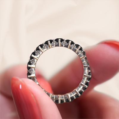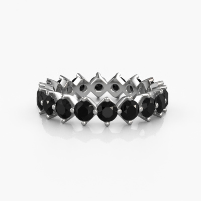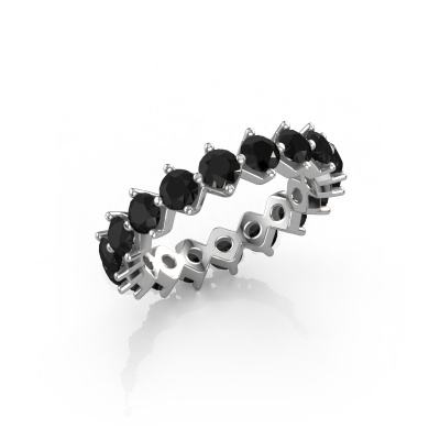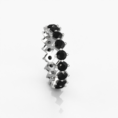 This is our Janie 3.4mm ring. This specific type is called an eternity ring and it is set with a continuous line of identically cut gemstones. The ring is made in 14 Carat white gold and is set with small black diamonds, 3.600 crt. The amazing black diamonds are identical in size and are set in the ring band. Our black diamonds are selected with great care so they are identical, which gives the best result. In order to get the best result, our artisans position all black diamonds by hand with the utmost care. Our Goldsmiths have one ambition, which is creating the perfect ring. That is why we love what we do. In the end you get a stunning luxury white gold stackable ring with a row of black diamonds which seem to have no beginning nor end. The perfect symbol of your undying love for her! How special is that!After receiving your order, our goldsmiths will passionately start the creative process of making your ring in our own studio. Because we don't have a big stockpile, these costs will not be passed on to you. Our pricing is proof of that! We offer top quality jewels at lowest price, guaranteed.Our talented designers add new designs to our online collection daily. Together they create a diverse collection of the finest jewellery. If you prefer to make a ring according your own design, please feel free to request a quote. We will make you an amazing offer, based on quality and price.To make it easier for you, we offer a 30 day return policy. Check our terms and conditions.