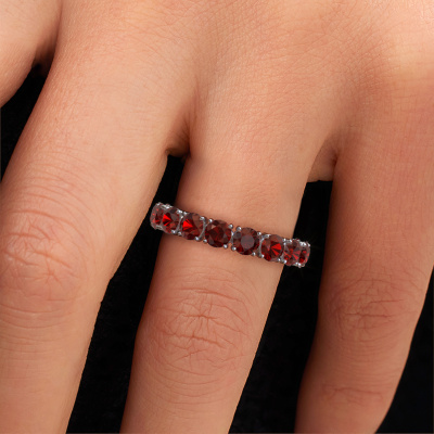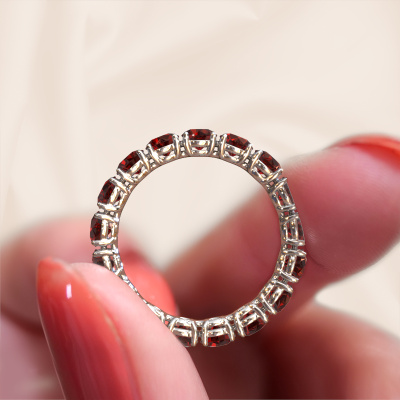 This is our Vivienne 3.7 ring. This specific type is called an eternity ring and it is set with a continuous line of identically cut gemstones. The ring is made in 14 Carat white gold and is set with small garnet, 3.7 mm. The amazing garnet are identical in size and are set in the ring band. Our garnet are selected with great care so they are identical, which gives the best result. In order to get the best result, our artisans position all garnet by hand with the utmost care. Our Goldsmiths have one ambition, which is creating the perfect ring. That is why we love what we do. In the end you get a stunning classic white gold stackable ring with a row of garnet which seem to have no beginning nor end. The perfect symbol of your undying love for her! How special is that!After receiving your order, our goldsmiths will start the creative process of making your Vivienne 3.7 ring. We don't keep stock. This is advantageous because these costs will not be passed on to you. Therefore, we can offer jewellery at exceptionally low prices.New jewellery designs are added to our online collection daily. Our team of passionate designers strive to create extraordinary and diverse designs. Have you seen a ring you like? Please feel free to contact us. Based on a good price/ quality ratio, we will make you an offer you can't refuse!To make it easier for you, we offer a 30 day return policy. Check our terms and conditions.