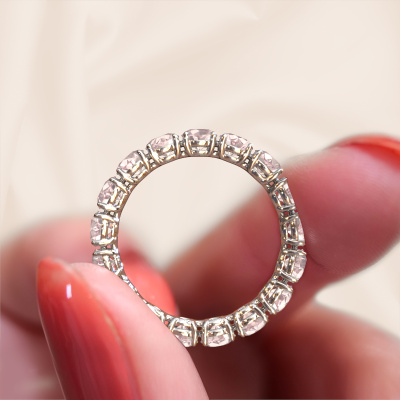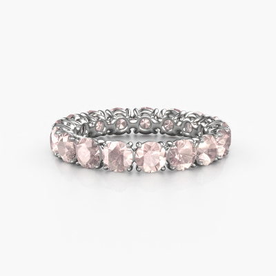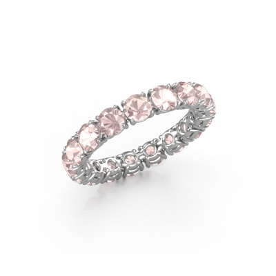 This is our Vivienne 3.7 ring. This specific type is called an eternity ring and it is set with a continuous line of identically cut gemstones. The ring is made in 14 Carat white gold and is set with small morganite champagne, 3.7 mm. The amazing morganite champagne are identical in size and are set in the ring band. Our morganite champagne are selected with great care so they are identical, which gives the best result. In order to get the best result, our artisans position all morganite champagne by hand with the utmost care. Our Goldsmiths have one ambition, which is creating the perfect ring. That is why we love what we do. In the end you get a stunning classic white gold stackable ring with a row of morganite champagne which seem to have no beginning nor end. The perfect symbol of your undying love for her! How special is that!