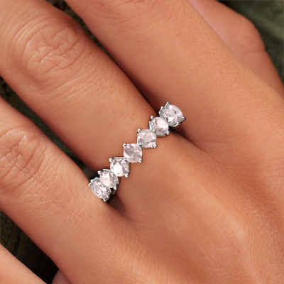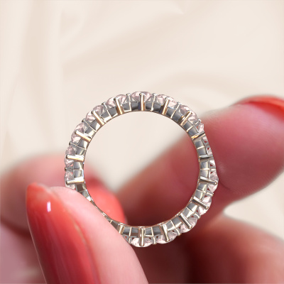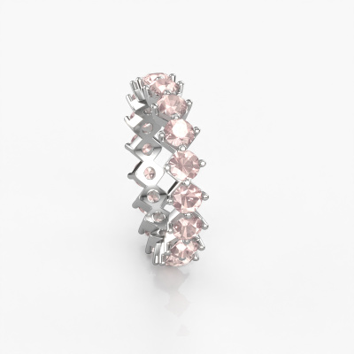 This is our Janie 3.4mm ring. This specific type is called an eternity ring and it is set with a continuous line of identically cut gemstones. The ring is made in 14 Carat white gold and is set with small morganite champagne, 3.4 mm. The amazing morganite champagne are identical in size and are set in the ring band. Our morganite champagne are selected with great care so they are identical, which gives the best result. In order to get the best result, our artisans position all morganite champagne by hand with the utmost care. Our Goldsmiths have one ambition, which is creating the perfect ring. That is why we love what we do. In the end you get a stunning luxury white gold stackable ring with a row of morganite champagne which seem to have no beginning nor end. The perfect symbol of your undying love for her! How special is that!