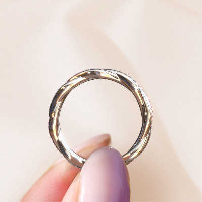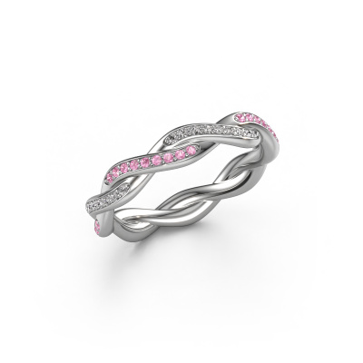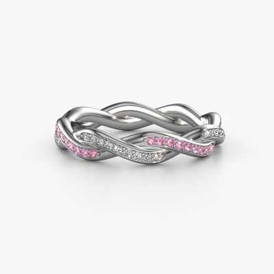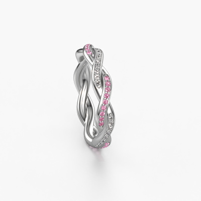 This is our Swing full ring. This specific type is called an eternity ring and it is set with a continuous line of identically cut gemstones. The ring is made in 14 Carat white gold and is set with small pink sapphire, 1 mm. The amazing pink sapphire are identical in size and are set in the ring band. Our pink sapphire are selected with great care so they are identical, which gives the best result. In order to get the best result, our artisans position all pink sapphire by hand with the utmost care. Our Goldsmiths have one ambition, which is creating the perfect ring. That is why we love what we do. In the end you get a stunning fantasy white gold stackable ring with a row of pink sapphire which seem to have no beginning nor end. The perfect symbol of your undying love for her! How special is that!After receiving your order, our goldsmiths will passionately start the creative process of making your ring in our own studio. Because we don't have a big stockpile, these costs will not be passed on to you. Our pricing is proof of that! We offer top quality jewels at lowest price, guaranteed.New jewellery designs are added to our online collection daily. Our team of passionate designers strive to create extraordinary and diverse designs. Have you seen a ring you like? Please feel free to contact us. Based on a good price/ quality ratio, we will make you an offer you can't refuse!To make it easier for you, we offer a 30 day return policy. Check our terms and conditions.
