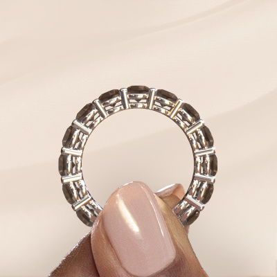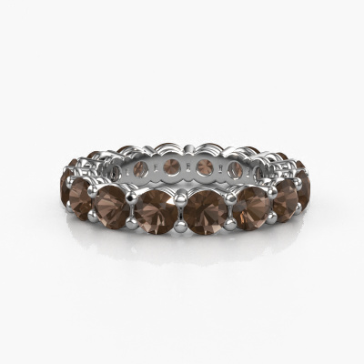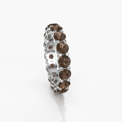 This is our Michelle full 4.0 ring. This specific type is called an eternity ring and it is set with a continuous line of identically cut gemstones. The ring is made in 14 Carat white gold and is set with small smokey quartz, 4 mm. The amazing smokey quartz are identical in size and are set in the ring band. Our smokey quartz are selected with great care so they are identical, which gives the best result. In order to get the best result, our artisans position all smokey quartz by hand with the utmost care. Our Goldsmiths have one ambition, which is creating the perfect ring. That is why we love what we do. In the end you get a stunning modern white gold stackable ring with a row of smokey quartz which seem to have no beginning nor end. The perfect symbol of your undying love for her! How special is that!By using a combination of the latest modern techniques, combined with ancient crafting, we can make all our rings in our own studio. Each jewel is made to order. This is advantageous because we can offer you a price you won't find anywhere else.Our talented designers add new designs to our online collection daily. Together they create a diverse collection of the finest jewellery. If you prefer to make a ring according your own design, please feel free to request a quote. We will make you an amazing offer, based on quality and price.To make it easier for you, we offer a 30 day return policy. Check our terms and conditions.