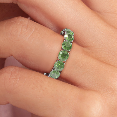 This Vivienne 4.0 stackable ring in 14 Carat white gold is set with tourmaline green. This white gold stacked Vivienne 4.0 ring is the perfect addition to your ring collection! As the name suggests, it is a ring which can be combined on one finger with another ring. It gives you the opportunity to create your own style. A stacked ring usually represents a certain memory of someone special or a memorable moment. It is common to combine a stacked ring, representing an anniversary, with a wedding ring. But this eternity ring, combined with your other rings, also makes a classy fashion item. A customized modern stackable ring is the perfect gift! New exquisite designs are added daily by our team of passionate goldsmiths. And each design can be customized. Simply customize the precious metals and the colour of gemstones which will be used, for example. This makes your design of the modern Vivienne 4.0 stackable ring truly unique!Because we design and deliver our own rings, we can offer you a ring at a price you won't find anywhere else. A ring is made to order, which helps prevent excess supplies, so we can make you a great price offer. We understand it feels risky, buying your ring online, but we will gladly assist in the designing process, taking your budget into consideration.To make it easier for you, we offer a 30 day return policy. Check our terms and conditions.