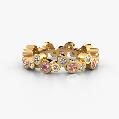 This is our Tessa ring. This specific type is called an eternity ring and it is set with a continuous line of identically cut gemstones. The ring is made in 14 Carat gold and is set with small tourmaline pink, 2.5 mm. This gold Eternity ring is a perfectly beautiful and meaningful way to give your proposal that special touch. The magnificent evenly shaped tourmaline pink are pave set around the ring. The identical tourmaline pink are carefully selected to give the ring a maximum effect. Do keep in mind we use natural resources so small differences between stones are common. The special effect is enhanced due to precise positioning of the tourmaline pink. This requires the utmost precision and a skilful hand but for our skilled artisans this is what excites them. The result is a ring with a row of tourmaline pink which seem to have no beginning nor end. The perfect symbol of your love for her! Isn't she a beauty?By using our modern techniques, we can design and customize the finest quality jewels with the utmost care for you. Our rings are always priced 30 percent lower than other jewellers. We make rings to order, so we don't have to maintain a large stock. If you have a certain budget, we are more than happy to advice you accordingly.Our talented designers add new designs to our online collection daily. Together they create a diverse collection of the finest jewellery. If you prefer to make a ring according your own design, please feel free to request a quote. We will make you an amazing offer, based on quality and price.To make it easier for you, we offer a 30 day return policy. Check our terms and conditions.