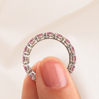 This is our Vivienne OVL 4x3 ring. This specific type is called an eternity ring and it is set with a continuous line of identically cut gemstones. The ring is made in 14 Carat white gold and is set with small tourmaline pink, 4x3 mm. This white gold Eternity ring is a perfectly beautiful and meaningful way to give your proposal that special touch. The magnificent evenly shaped tourmaline pink are pave set around the ring. The identical tourmaline pink are carefully selected to give the ring a maximum effect. Do keep in mind we use natural resources so small differences between stones are common. The special effect is enhanced due to precise positioning of the tourmaline pink. This requires the utmost precision and a skilful hand but for our skilled artisans this is what excites them. The result is a ring with a row of tourmaline pink which seem to have no beginning nor end. The perfect symbol of your love for her! Isn't she a beauty?Because we design and deliver our own rings, we can offer you a ring at a price you won't find anywhere else. A ring is made to order, which helps prevent excess supplies, so we can make you a great price offer. We understand it feels risky, buying your ring online, but we will gladly assist in the designing process, taking your budget into consideration.Our team of talented, passionate designers add new ring designs to our online collection daily. Our objective in doing so, is to be able to offer you a wide variety of jewels. Please feel free to request a quote if you have specific wishes for your ring. We guarantee to make you an offer you can't refuse.To make it easier for you, we offer a 30 day return policy. Check our terms and conditions.