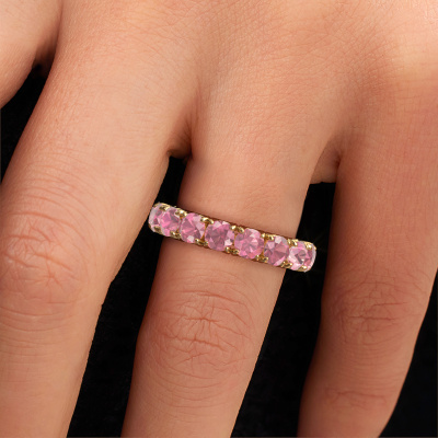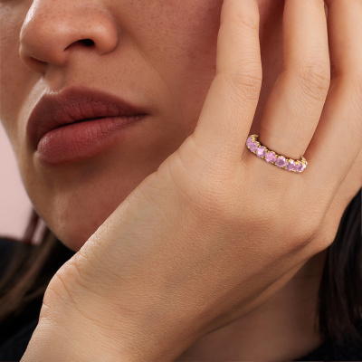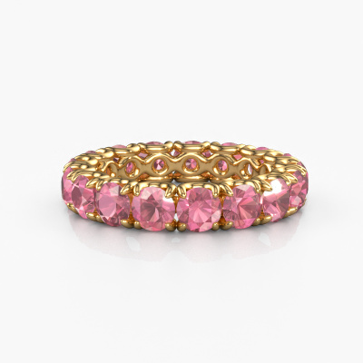 This Estee 4.0 ring in 14 Carat gold is set with tourmaline pink. This gold stacked Estee 4.0 ring is the perfect addition to your ring collection! As the name suggests, it is a ring which can be combined on one finger with another ring. It gives you the opportunity to create your own style. A stacked ring usually represents a certain memory of someone special or a memorable moment. It is common to combine a stacked ring, representing an anniversary, with a wedding ring. But this eternity ring, combined with your other rings, also makes a classy fashion item. As soon as you finished designing your Estee 4.0 ring with our online tool, our goldsmiths will start their creative process of making your ring. This will be done with passion and care, according ancient crafting. On top of that, our jewels are made of eco-friendly materials. Simply customize online with our online tool, if you want any changes made. If you want specific changes made to your Estee 4.0 ring, that are unavailable in our online tool, please feel free to contact our expert designers.By using our modern techniques, we can design and customize the finest quality jewels with the utmost care for you. Our rings are always priced 30 percent lower than other jewellers. We make rings to order, so we don't have to maintain a large stock. If you have a certain budget, we are more than happy to advice you accordingly.To make it easier for you, we offer a 30 day return policy. Check our terms and conditions.