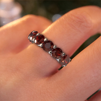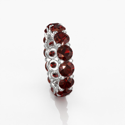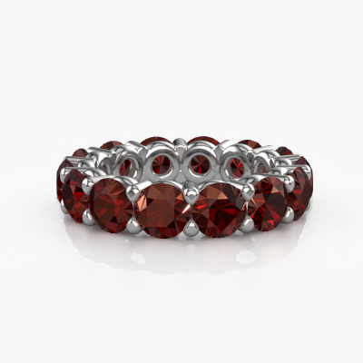 This is our Heddy rnd 5.0 ring. This specific type is called an eternity ring and it is set with a continuous line of identically cut gemstones. The ring is made in 14 Carat white gold and is set with small garnet, 5 mm. The amazing garnet are identical in size and are set in the ring band. Our garnet are selected with great care so they are identical, which gives the best result. In order to get the best result, our artisans position all garnet by hand with the utmost care. Our Goldsmiths have one ambition, which is creating the perfect ring. That is why we love what we do. In the end you get a stunning exclusive white gold ring with a row of garnet which seem to have no beginning nor end. The perfect symbol of your undying love for her! How special is that!By using a combination of the latest modern techniques, combined with ancient crafting, we can make all our rings in our own studio. Each jewel is made to order. This is advantageous because we can offer you a price you won't find anywhere else.